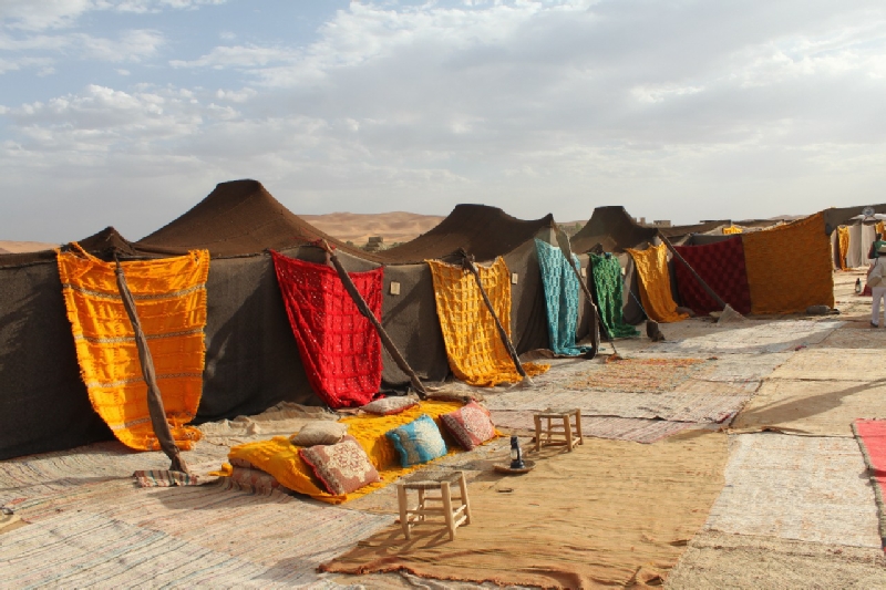 During private Morocco tour we stay in desert camp bivouac in Merzouga desert or Zagora desert. Desert camp is located in sand dunes , reachable by camel ride within 1 hour. You may chose to reach desert camp by camel or 4x4 cart if you prefer.